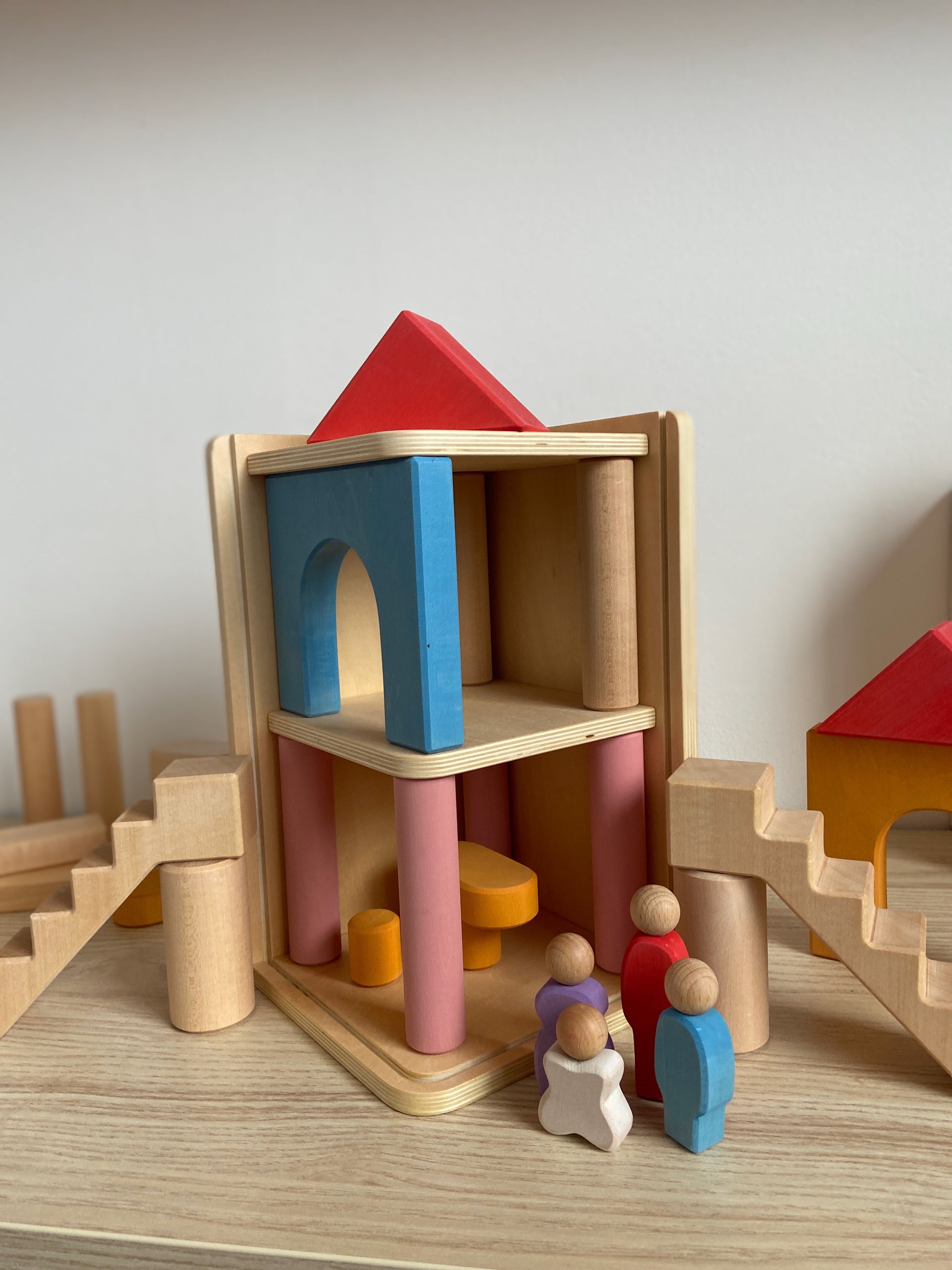 And speaking of figures: the set includes a family of five wooden people and a little dog, ready to move into whatever world your child imagines. These figures turn every build into a story. One day they might live in a tall apartment building, the next they might run a shop or explore a museum built entirely from blocks.