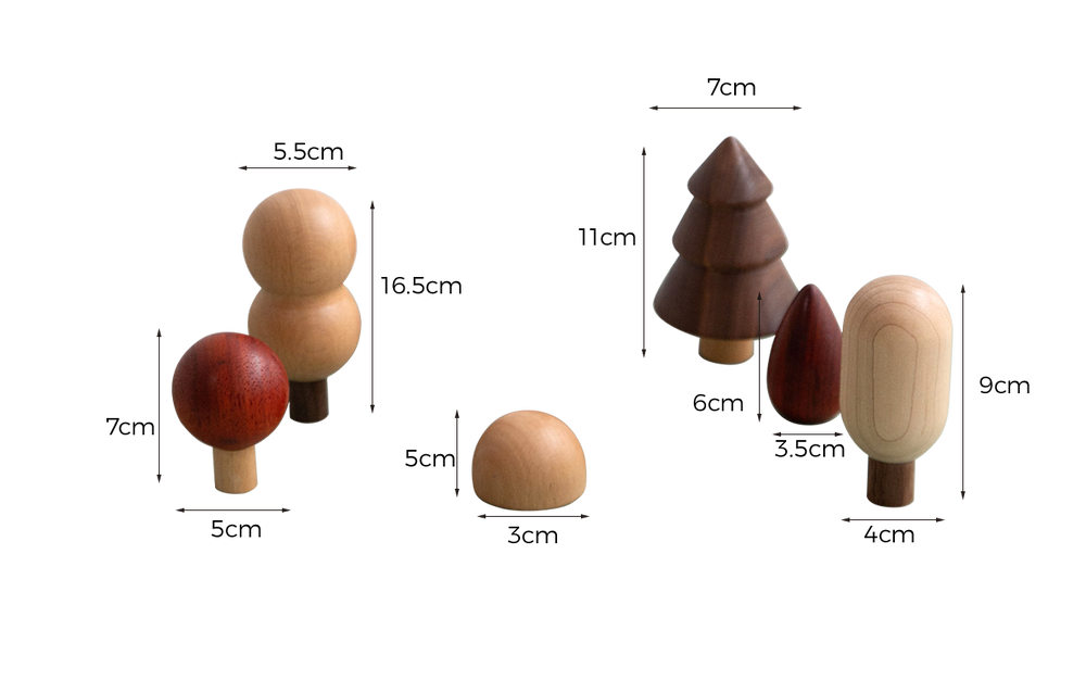 The Natural Forest Set features beautifully rounded trees crafted from 4 types of wood. It allows kids to explore the natural properties of different wood types and learn about the natural colors found in nature. Smooth, grippy, and lightweight, these trees are perfect for pretend play.