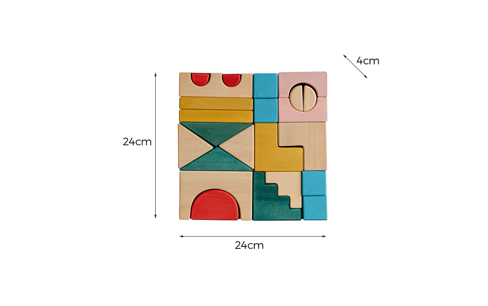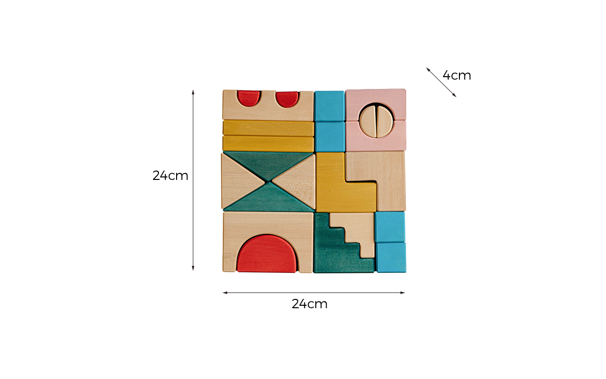 The AVDAR Candy Block Set includes 23 carefully handcrafted pieces. From basic shapes like cubes, triangles, and brick blocks to more unique ones like arcs, half cylinders, and stair shapes, this set offers a wide range of colorful wooden pieces that inspire endless play ideas.