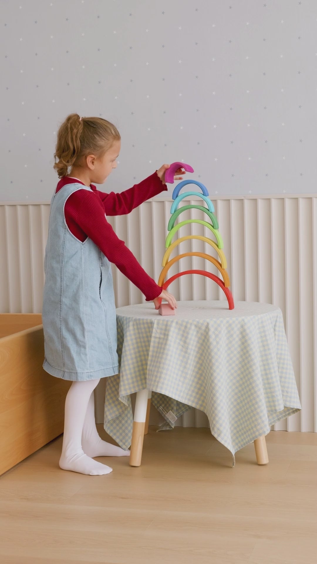 Each AVDAR rainbow stacker is handmade from a single piece of solid linden wood, making every set one of a kind. The natural grain and slight variations in shape give each rainbow its own unique character.