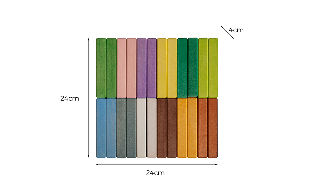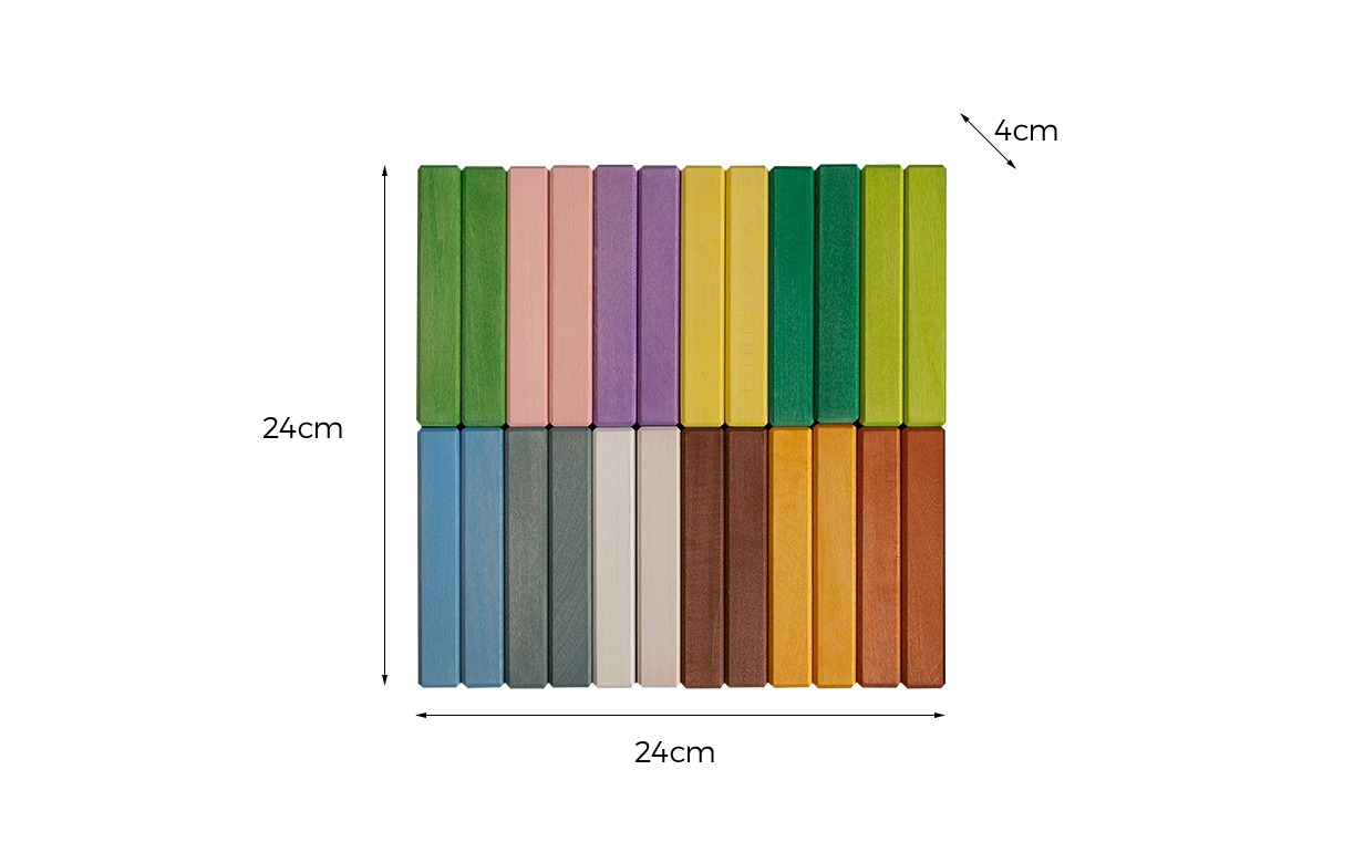 This 24-piece set features vibrant, rectangular brick-shaped blocks, offering endless opportunities for stacking, balancing, and imaginative play. It can be used alone or paired with other toys like the Rainbow Stacker and various building blocks.
