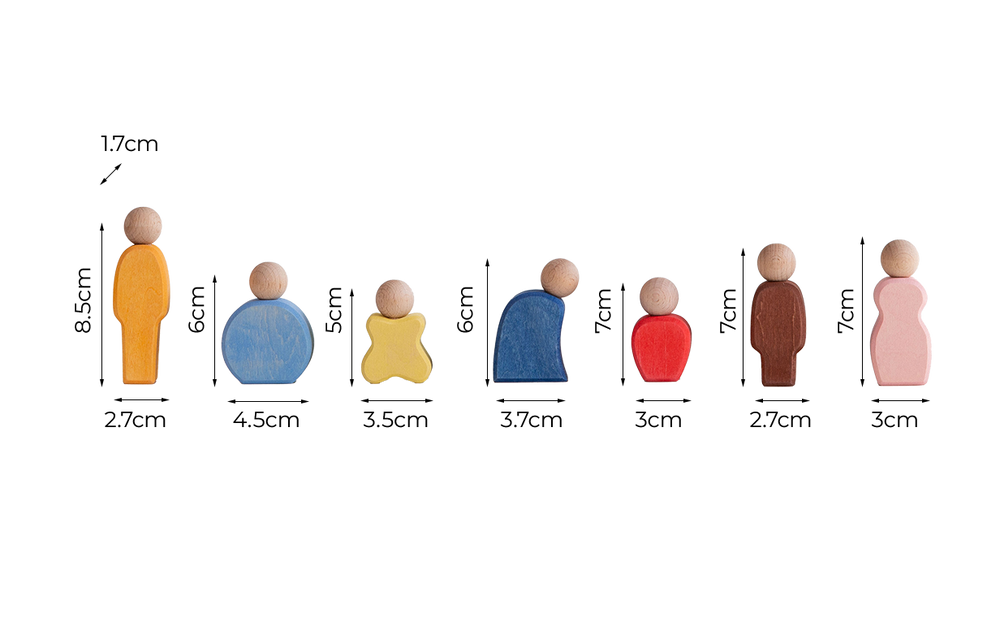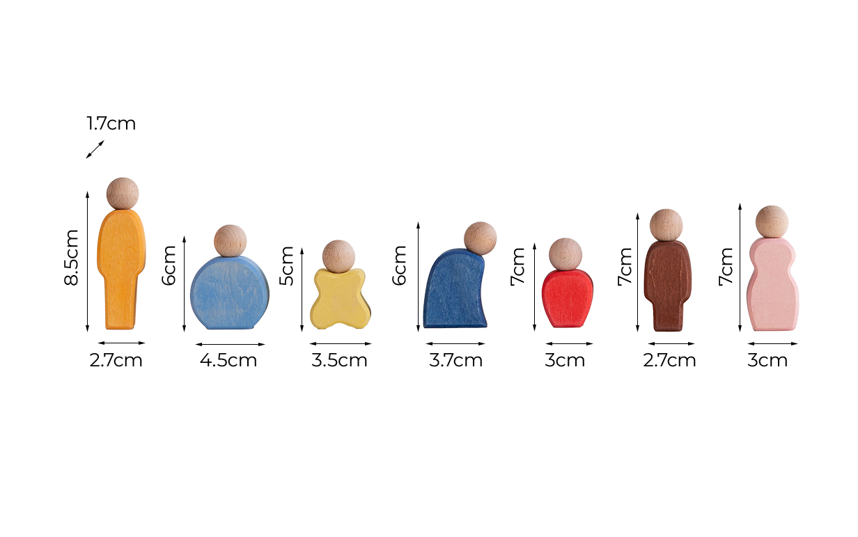 The Town Folks Set features seven peg dolls that represent different characters in our society. They have different shapes, ages, gender and roles. And can be perfect for story telling and can be addition to our Metropolis Block Set or any other set of blocks.