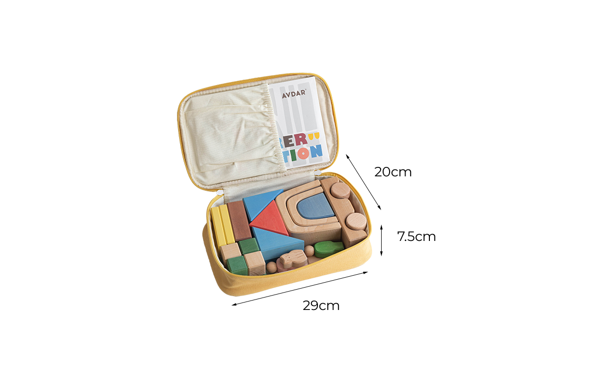 We designed this set to be portable, making it easy to take on the go, while also keeping children engaged with open-ended play. In addition to the wooden blocks, the toy also comes with a creative activity pack, all packed in a cotton bag.