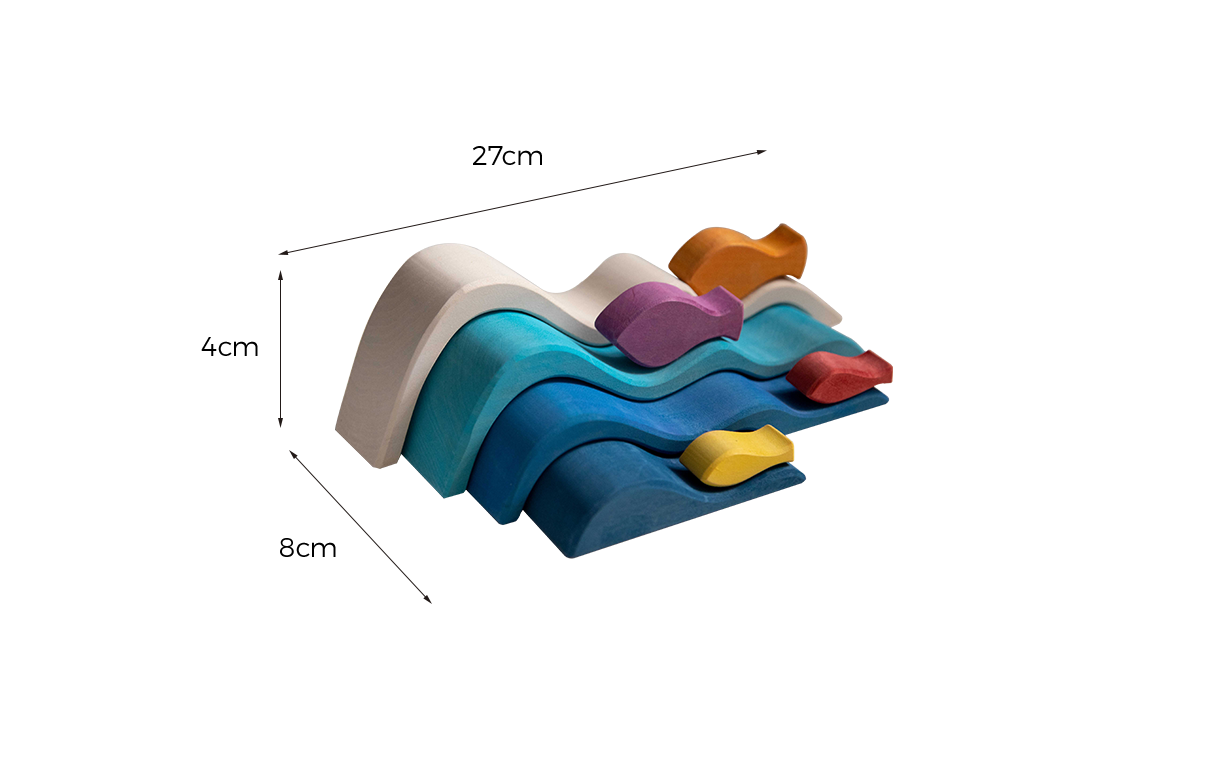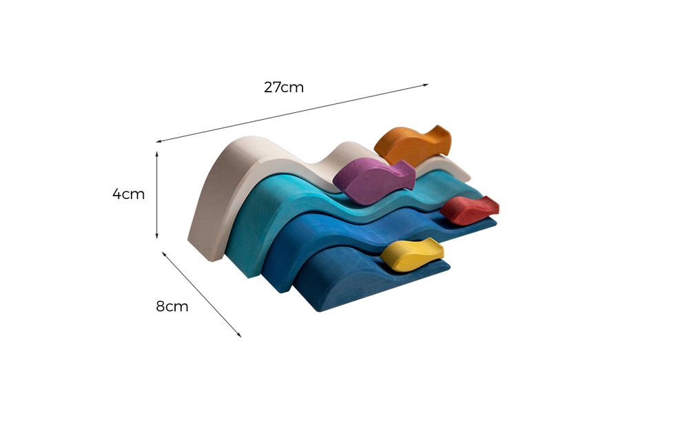 The Wave Block includes 4 waves and 4 fish of different sizes and colors. Smooth, grippy, and lightweight, these pieces are perfect for pretend play from an early age.